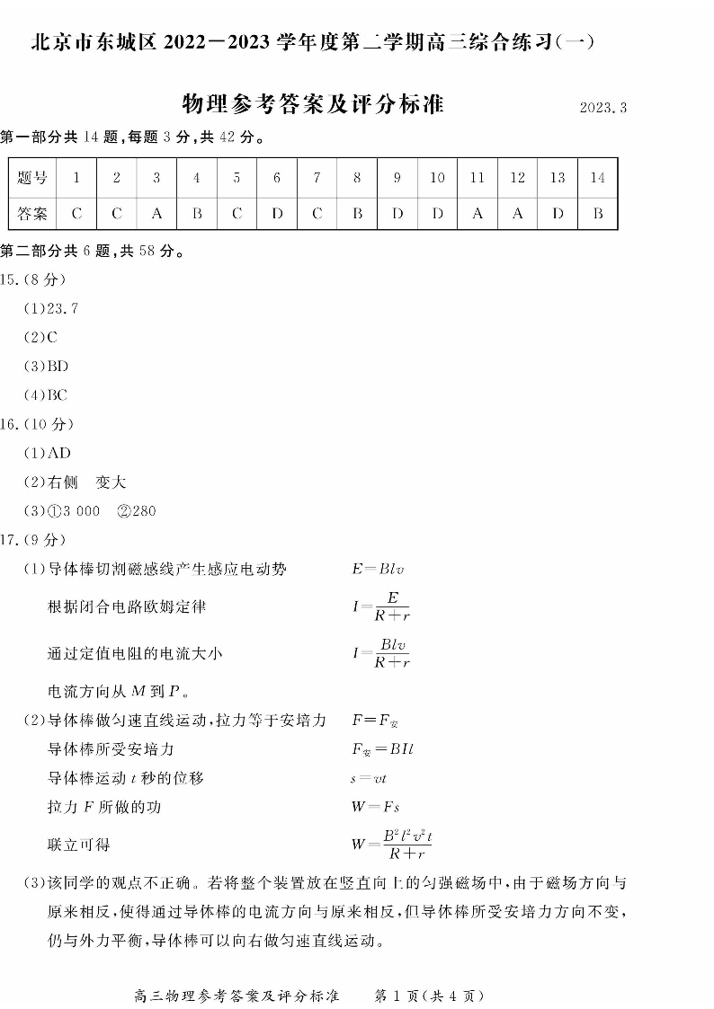 高三物理答案--北京市东城区2023高三一模