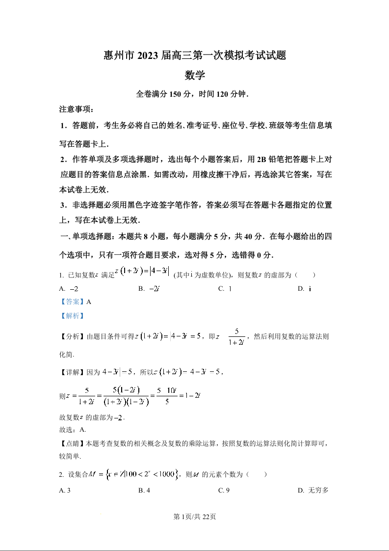 高三数学(精品解析版)--广东省惠州市2023届高考一模考试(惠州一模)