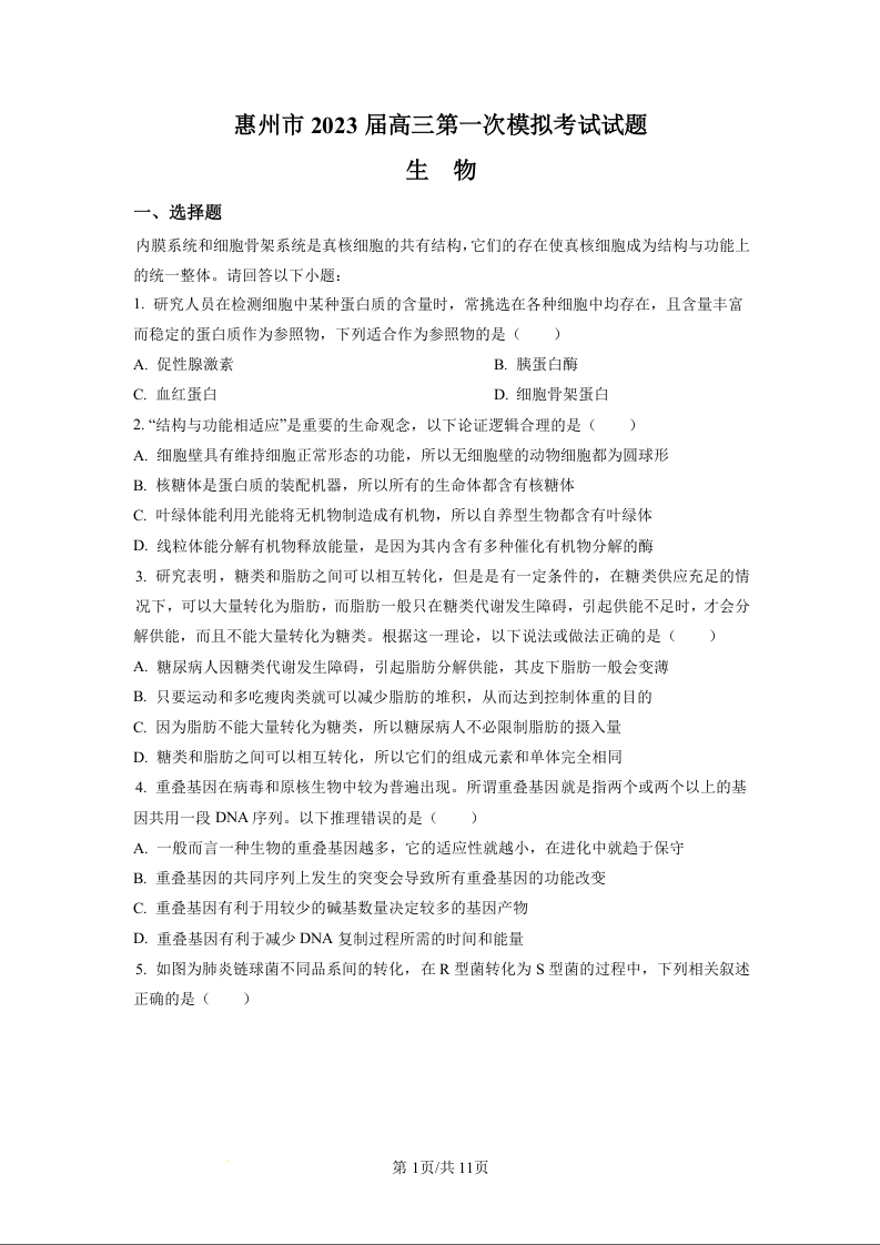 高三生物(原卷版)--广东省惠州市2023届高考一模考试(惠州一模)