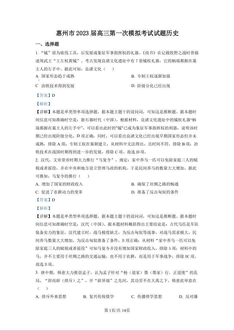 高三历史(精品解析版)--广东省惠州市2023届高考一模考试(惠州一模)