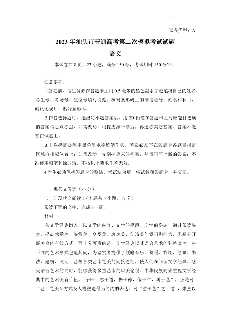 高三语文--广东省汕头市2023普通高考第二次模拟考试(汕头二模)