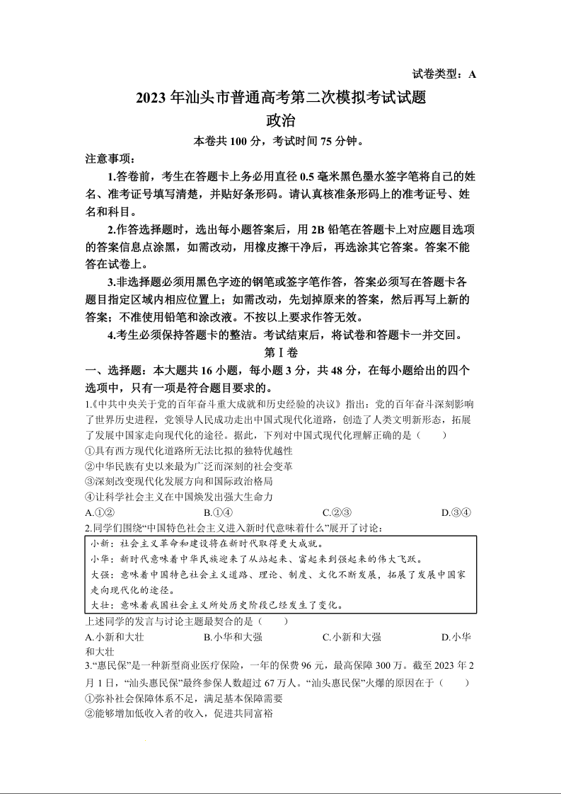 高三政治--广东省汕头市2023普通高考第二次模拟考试(汕头二模)