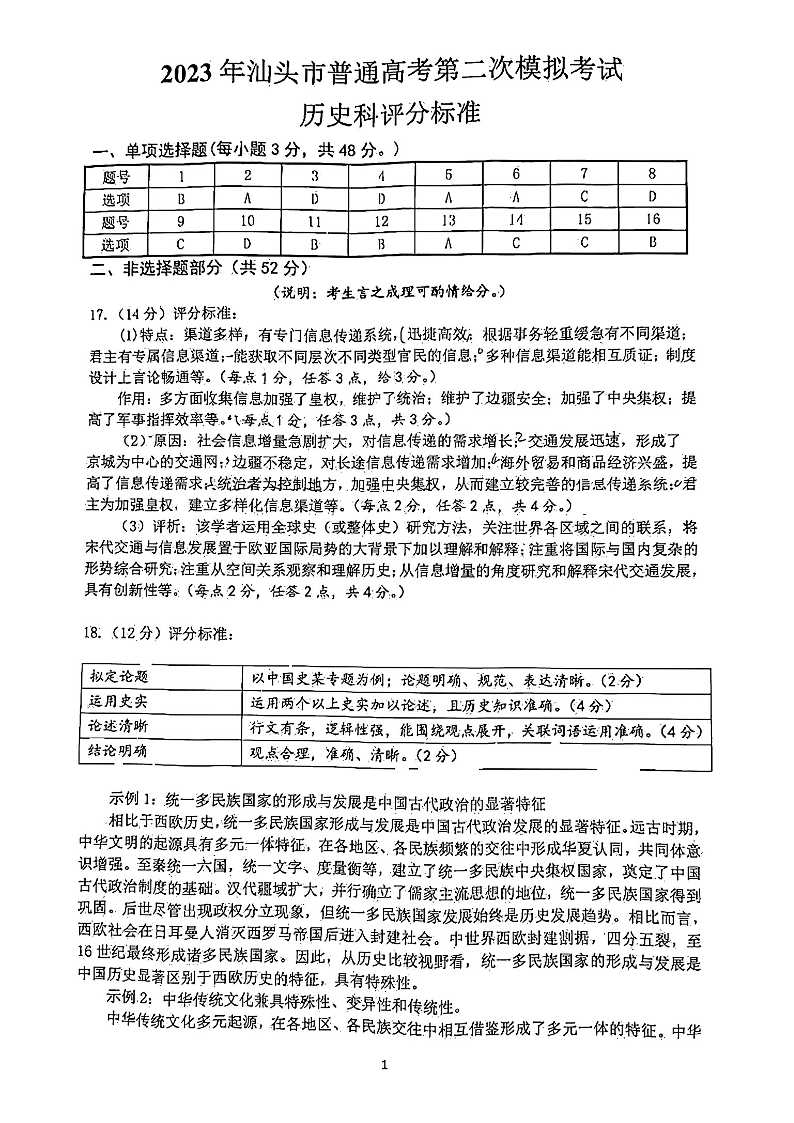 高三历史答案--广东省汕头市2023普通高考第二次模拟考试(汕头二模)