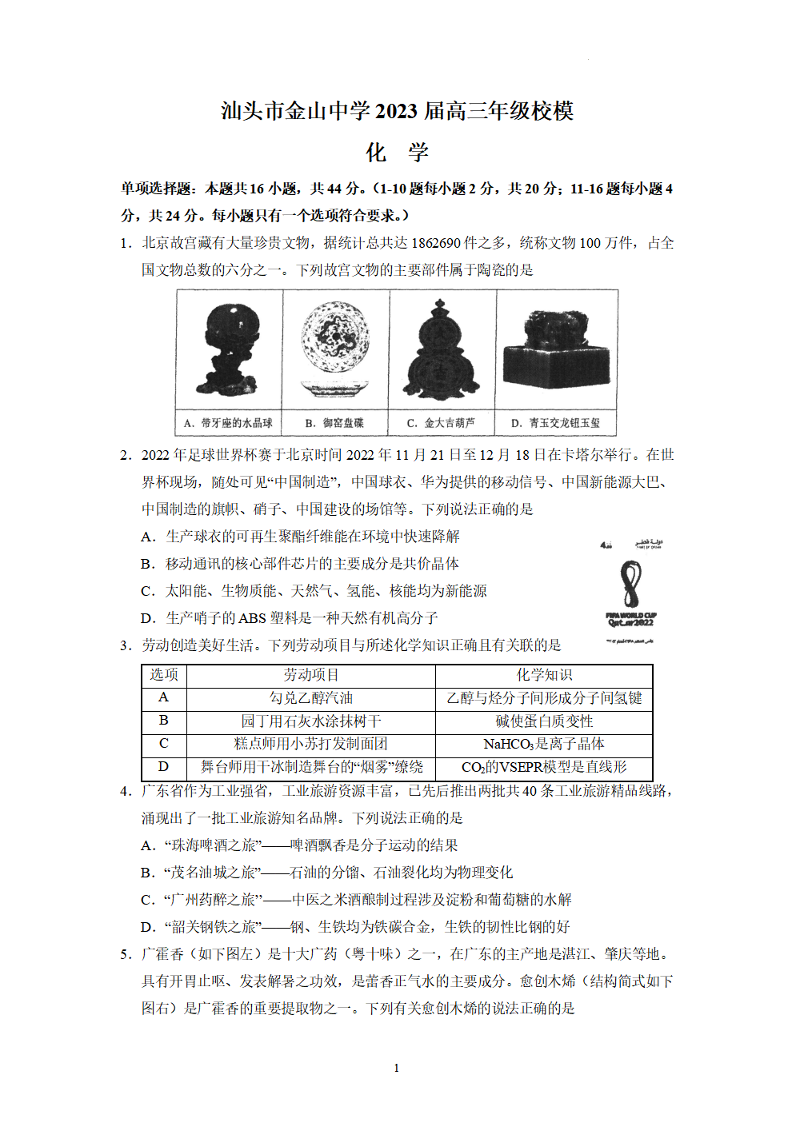 高三化学+答案--广东省汕头市金山中学2023届高三校模拟考试
