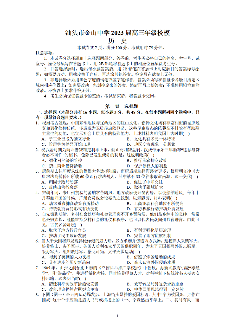 高三历史+答案--广东省汕头市金山中学2023届高三校模拟考试