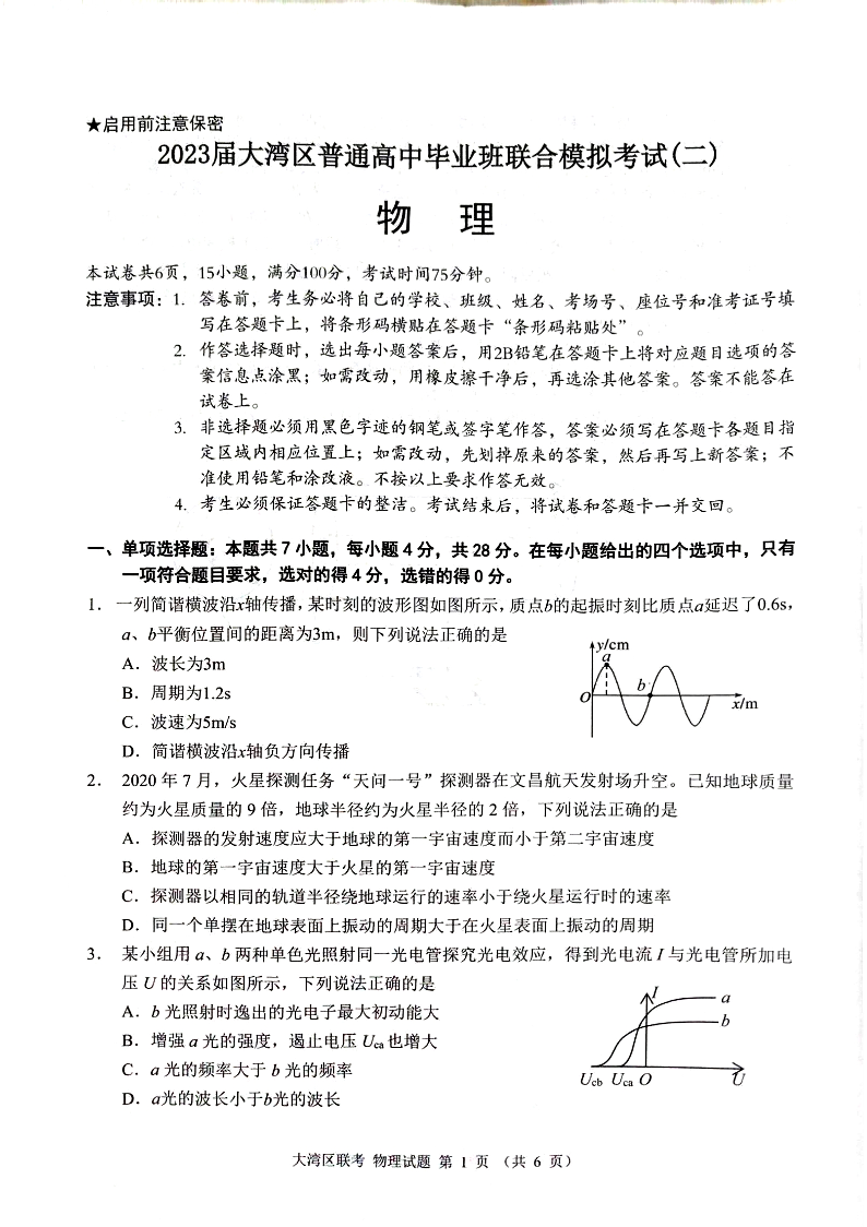 高三物理--广东省粤港澳大湾区2023普通高中毕业班联合模拟考试(二)