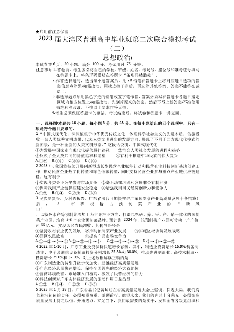 高三政治+答案--广东省粤港澳大湾区2023普通高中毕业班联合模拟考试(二)