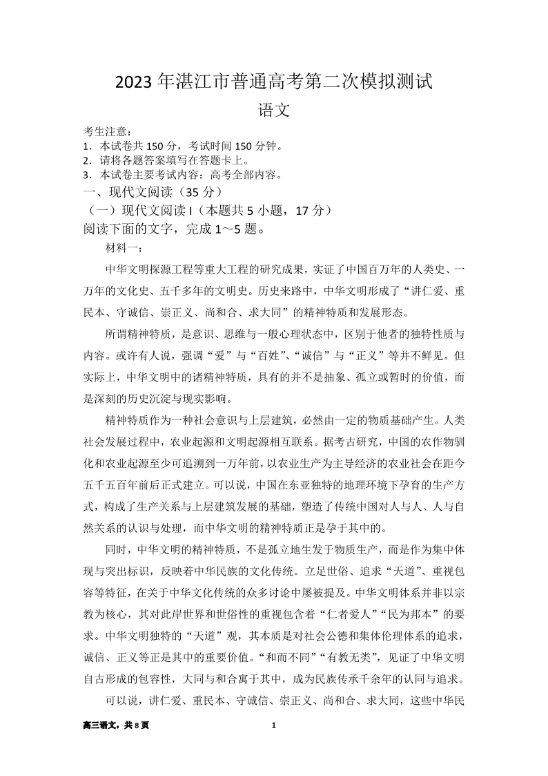 高三语文+答案--广东省湛江市2023届高考二模(23-379C)(湛江二模)