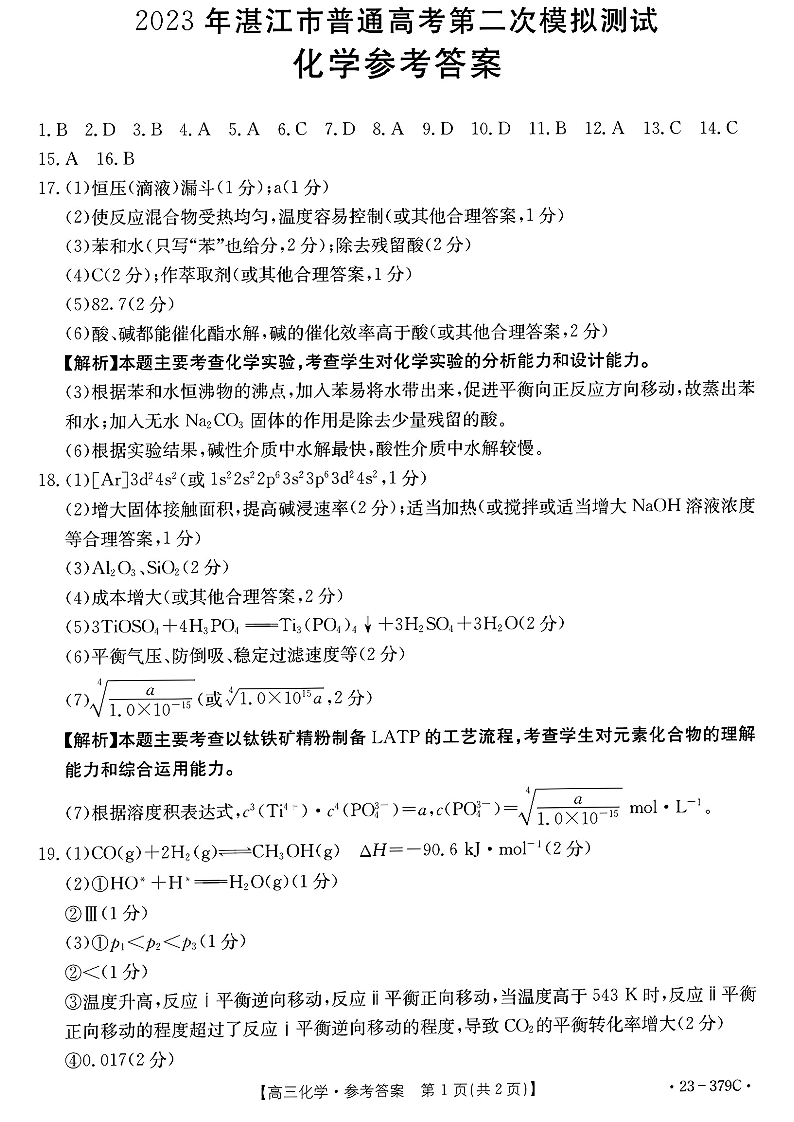 高三化学答案--广东省湛江市2023届高考二模(23-379C)(湛江二模)