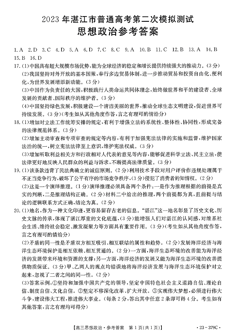 高三政治答案--广东省湛江市2023届高考二模(23-379C)(湛江二模)