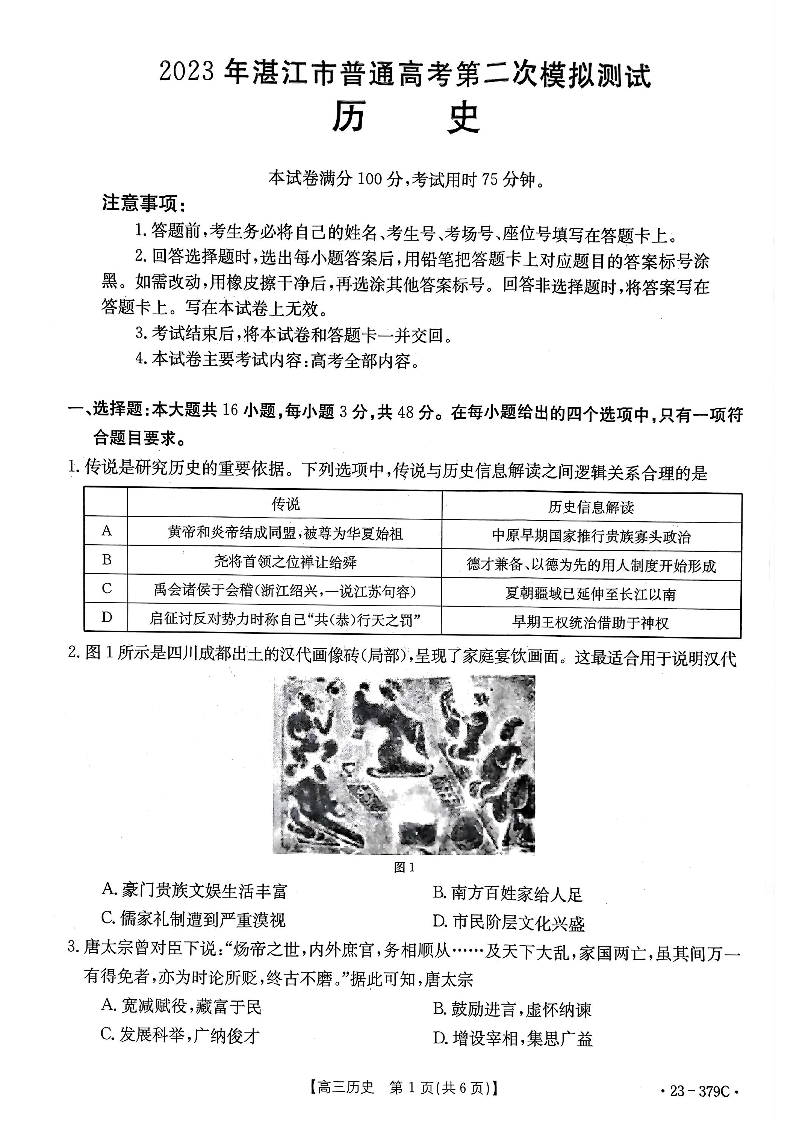 高三历史--广东省湛江市2023届高考二模(23-379C)(湛江二模)