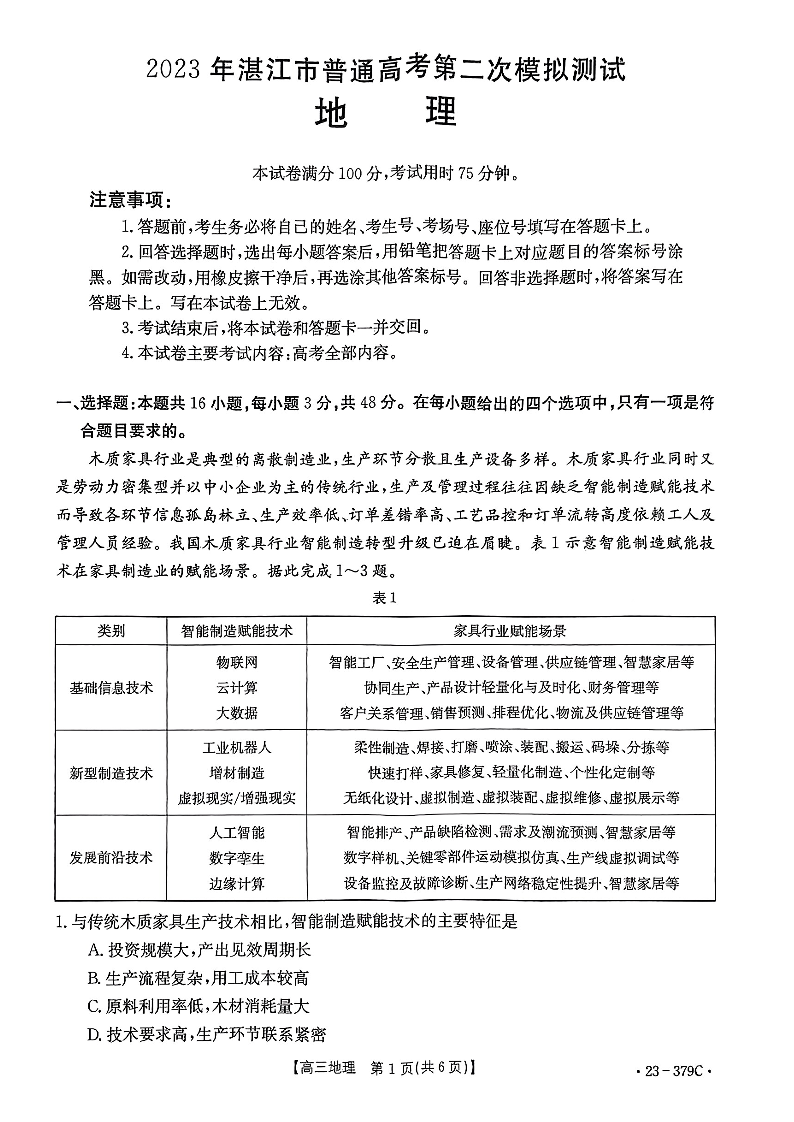 高三地理--广东省湛江市2023届高考二模(23-379C)(湛江二模)