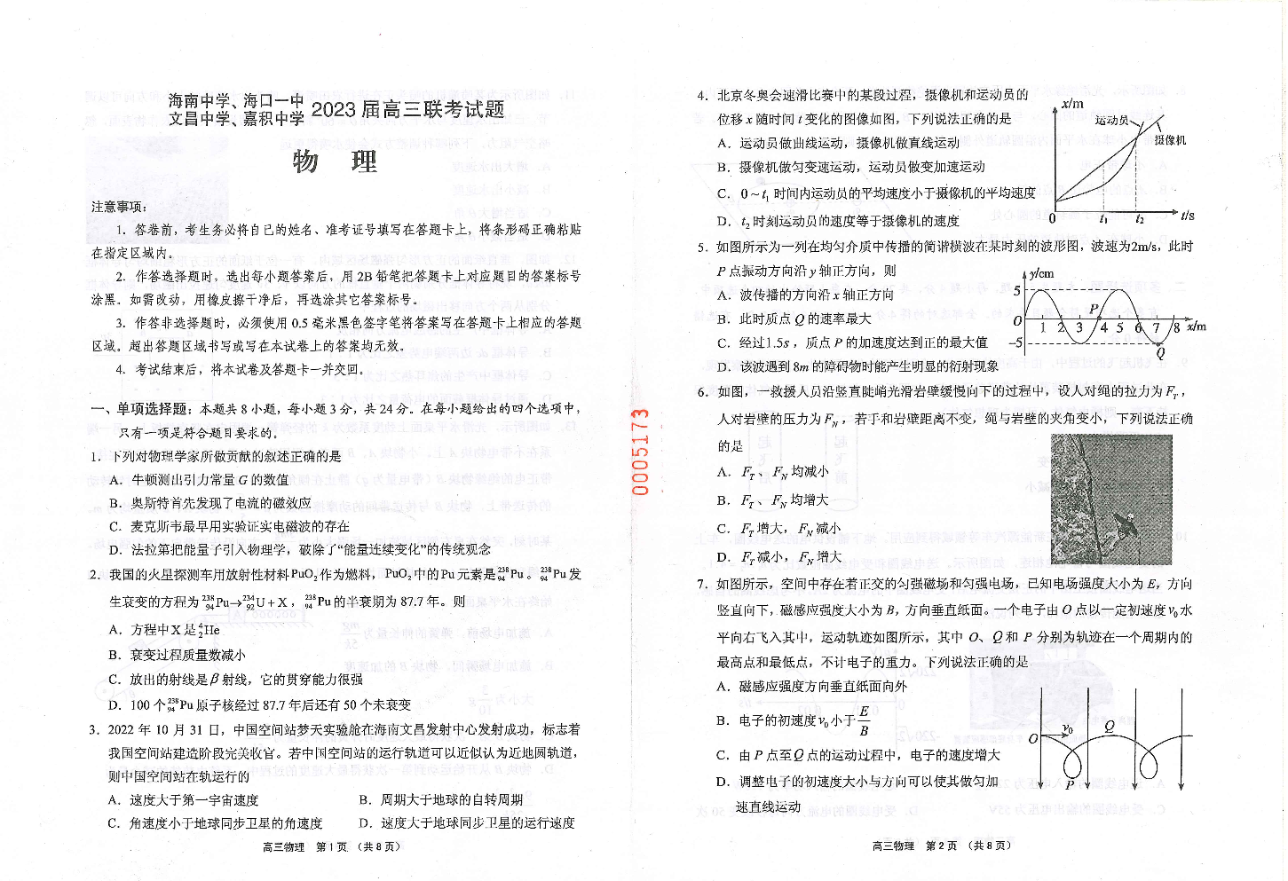 高三物理--海南省海南中学、海口一中、文昌中学、嘉积中学四校2023届高三下学期4月联考