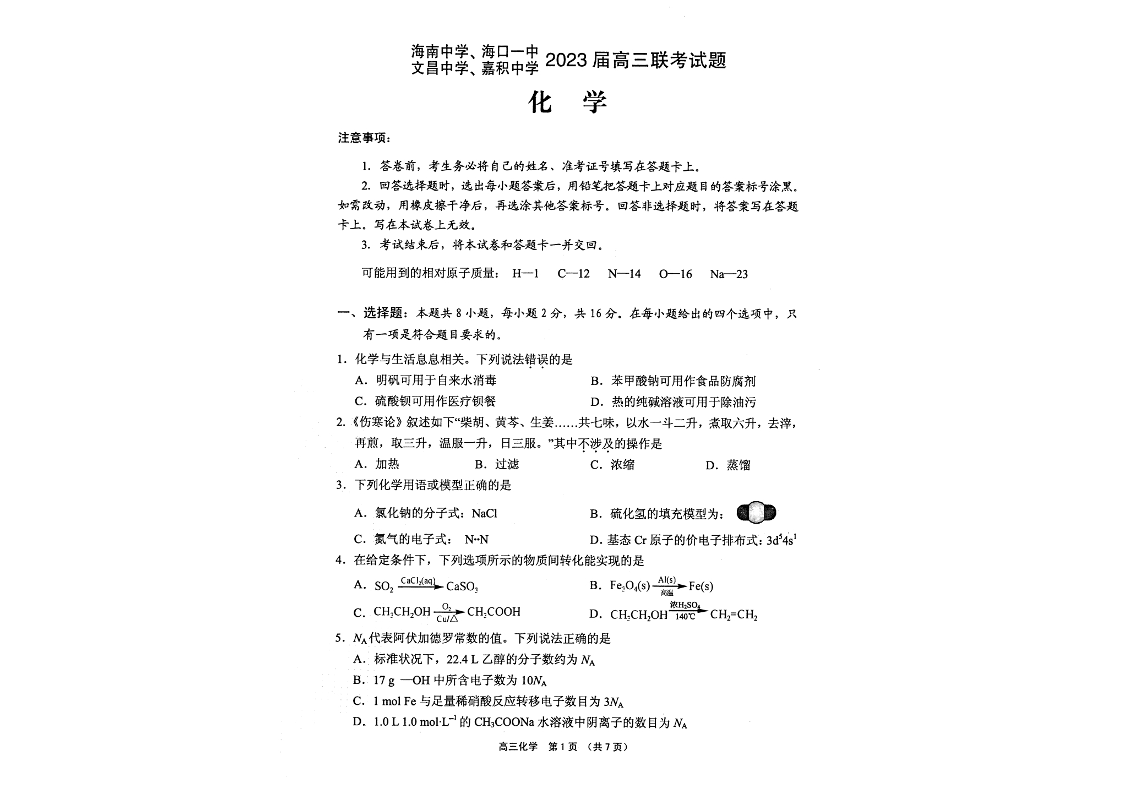 高三化学+答案--海南省海南中学、海口一中、文昌中学、嘉积中学四校2023届高三下学期4月联考