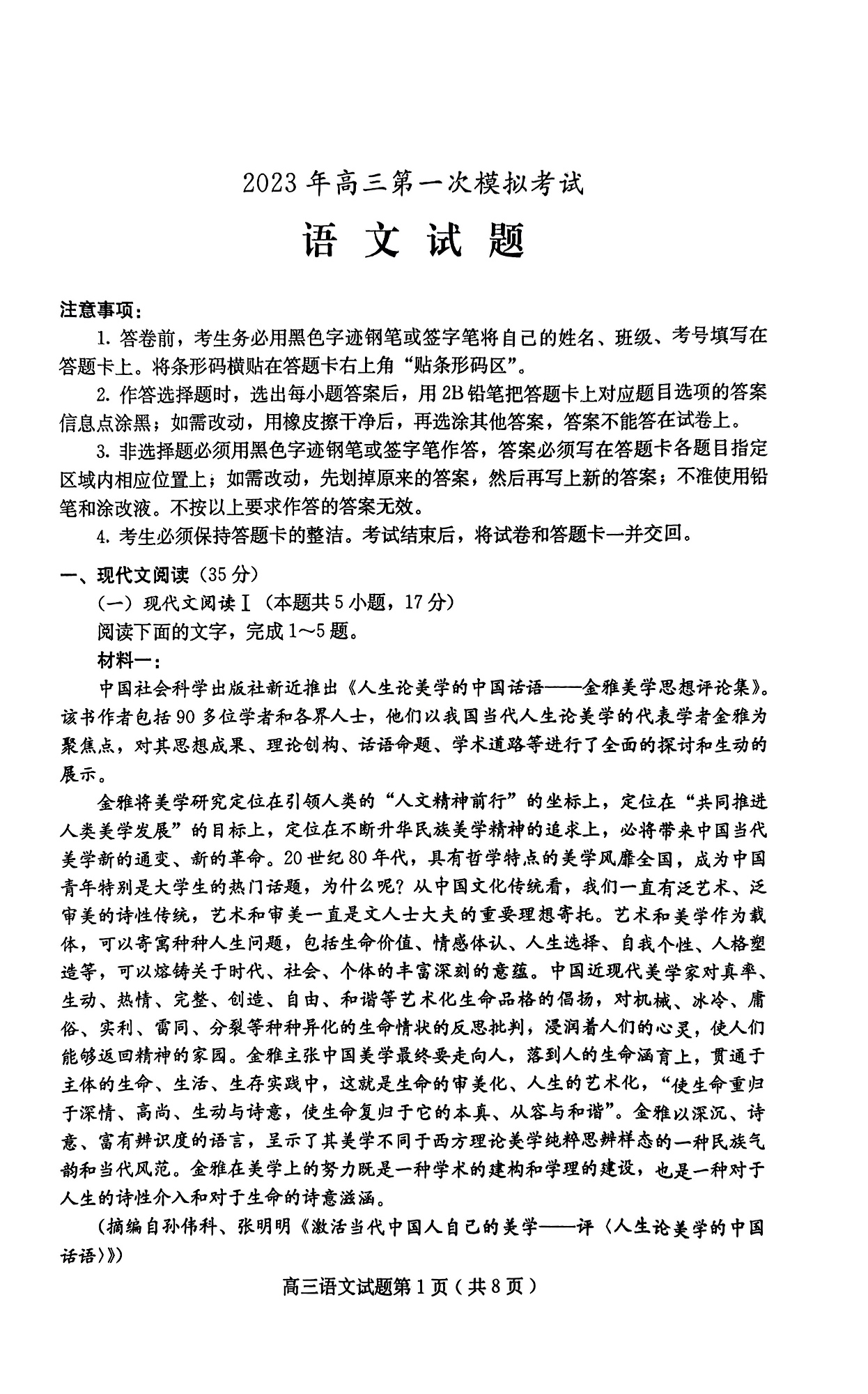 高三语文--河北保定2023年高三第一次模拟考试(保定一模)