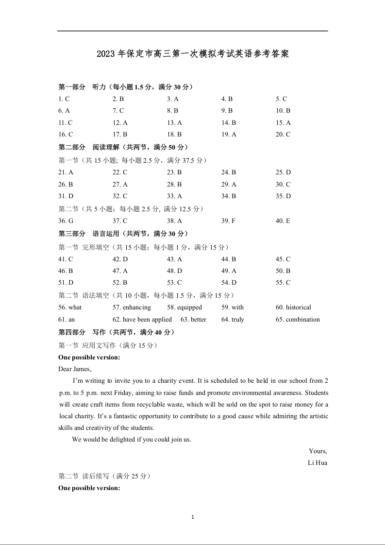 高三英语答案--河北保定2023年高三第一次模拟考试(保定一模)