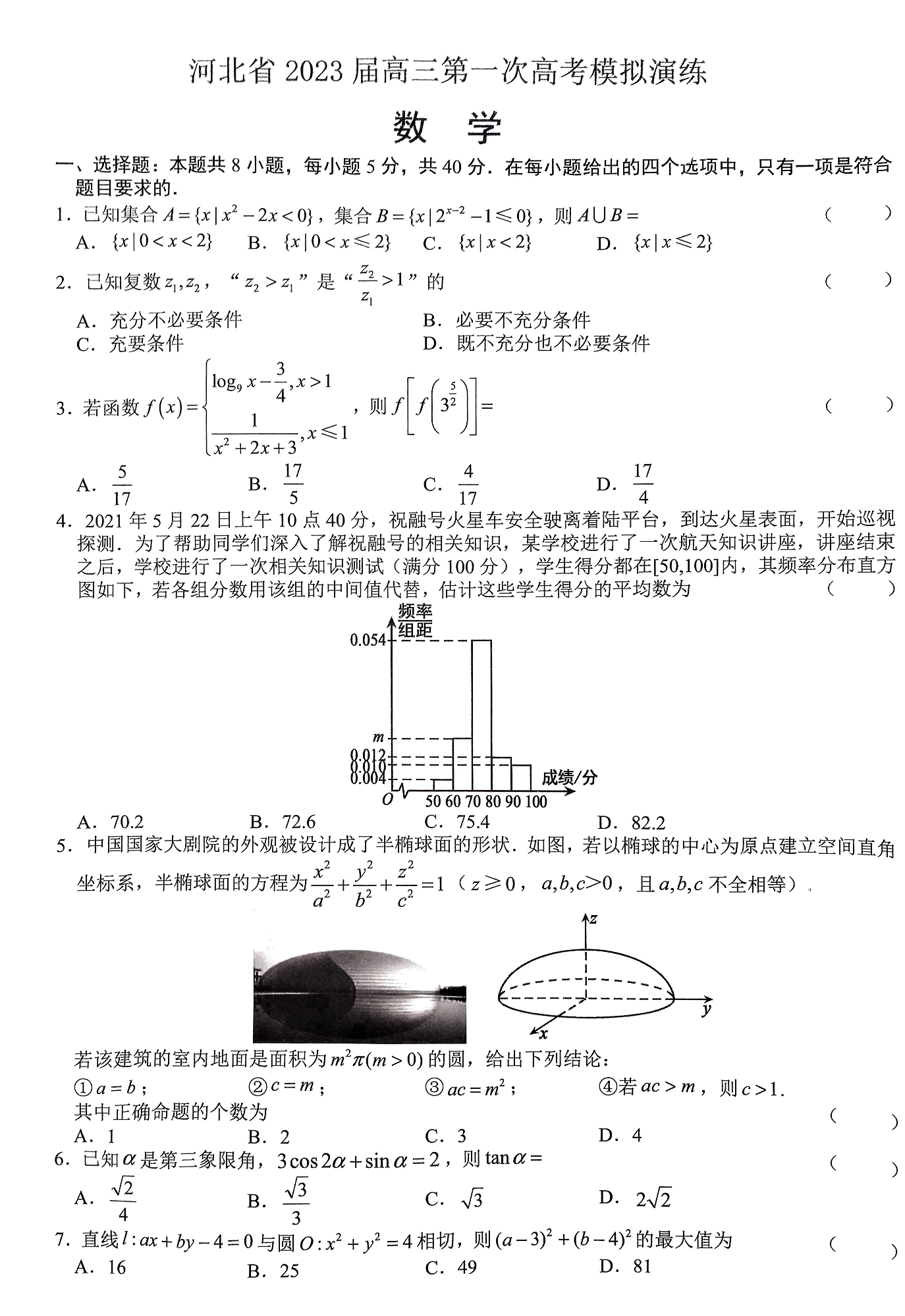 高三数学--河北省2023高三第一次高考模拟演练