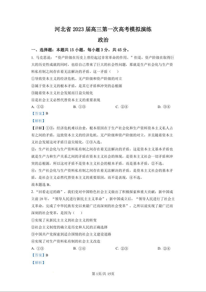 高三政治(解析版)--河北省2023高三第一次高考模拟演练