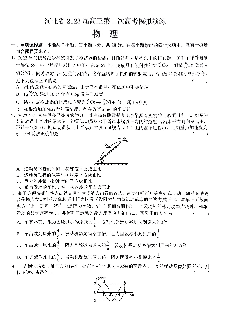 高三物理--河北省2023届高三第二次高考模拟演练(河北二模)