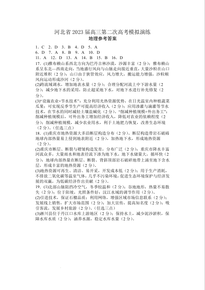 高三地理答案--河北省2023届高三第二次高考模拟演练(河北二模)