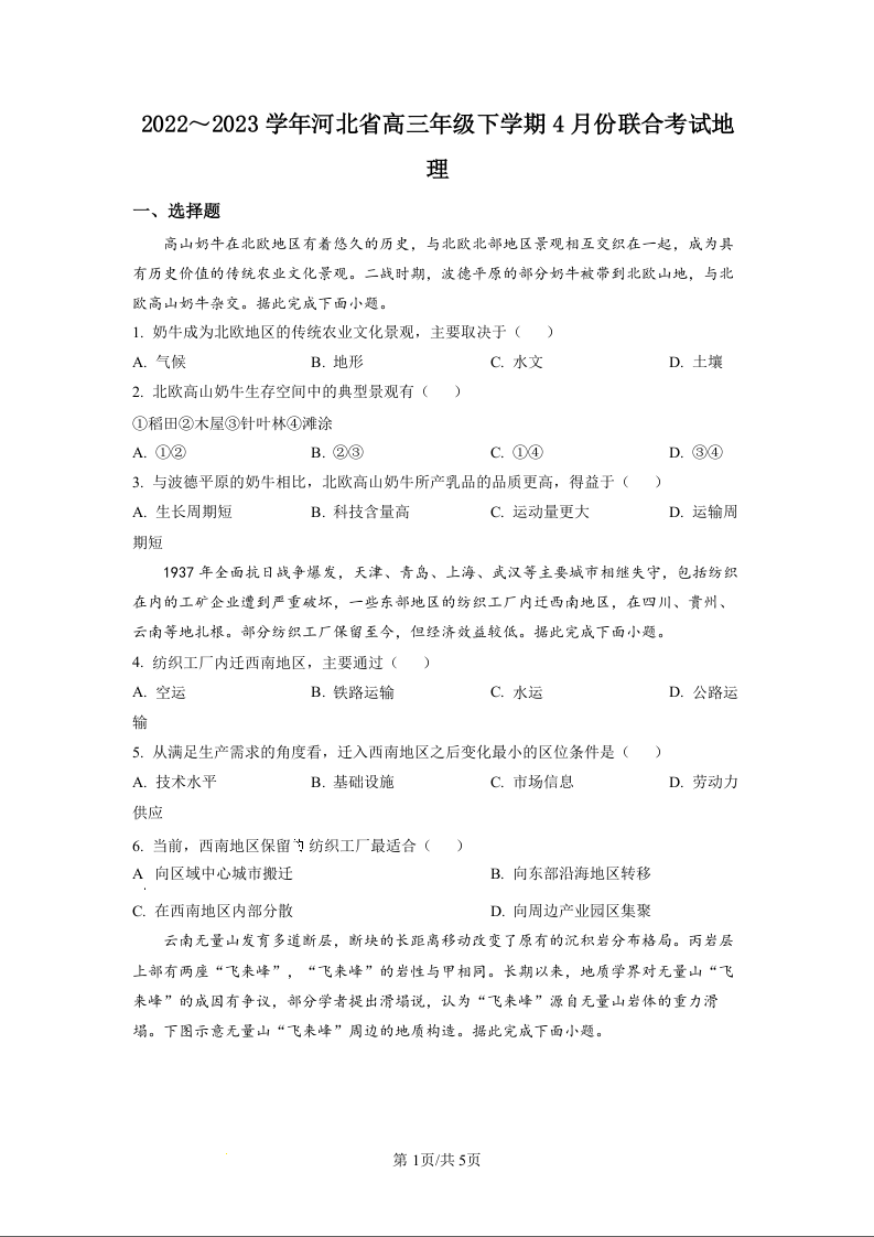 高三地理(原卷版)--河北省2023下学期高三4月联考