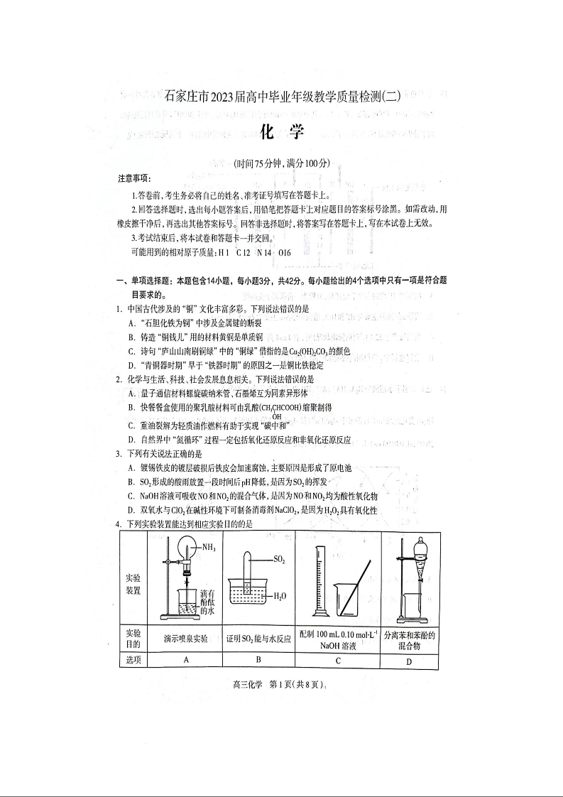 高三化学--河北省石家庄市2023届高中毕业年级教学质量检测(二)(石家庄二模)