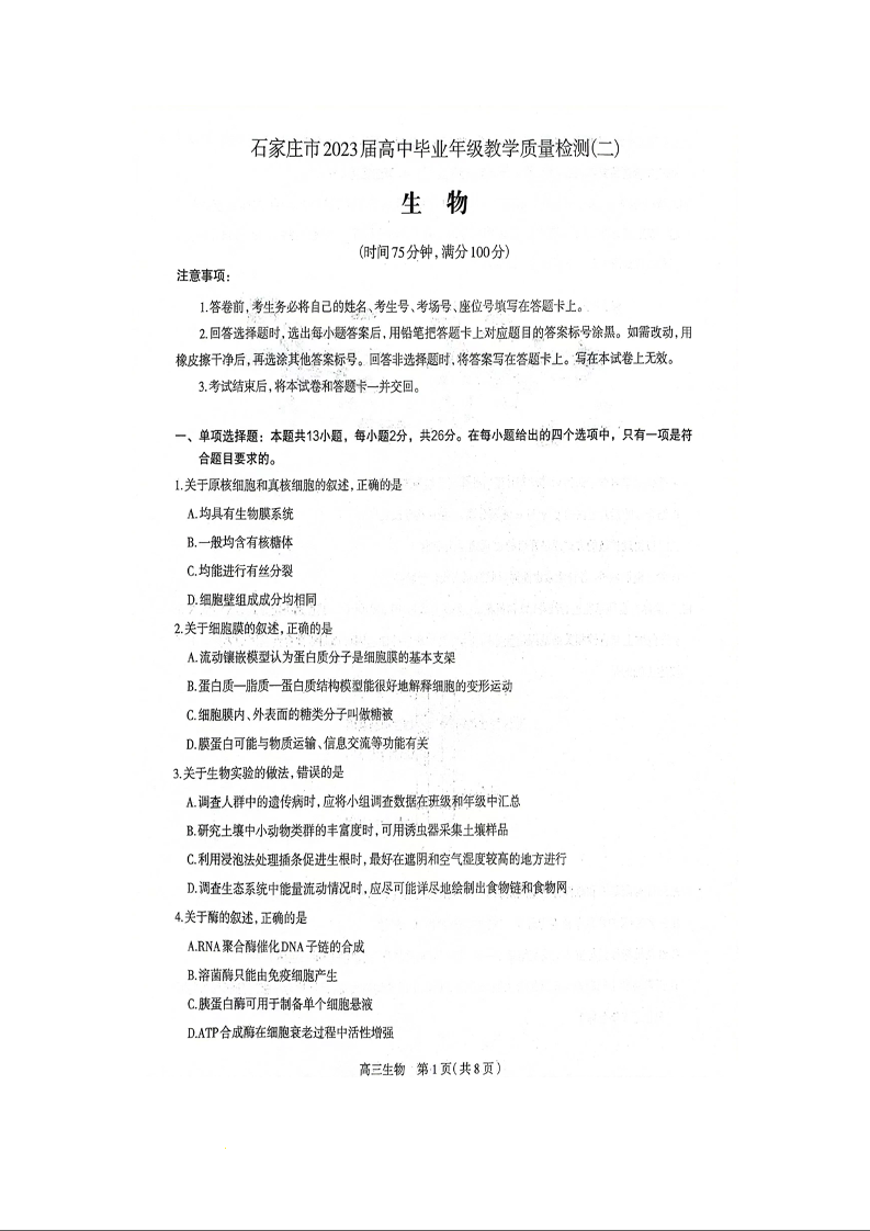 高三生物--河北省石家庄市2023届高中毕业年级教学质量检测(二)(石家庄二模)