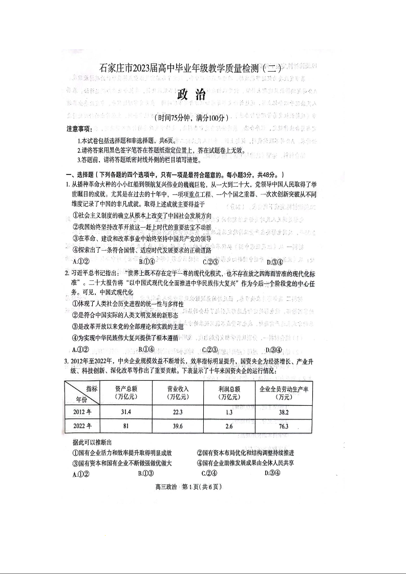 高三政治--河北省石家庄市2023届高中毕业年级教学质量检测(二)(石家庄二模)