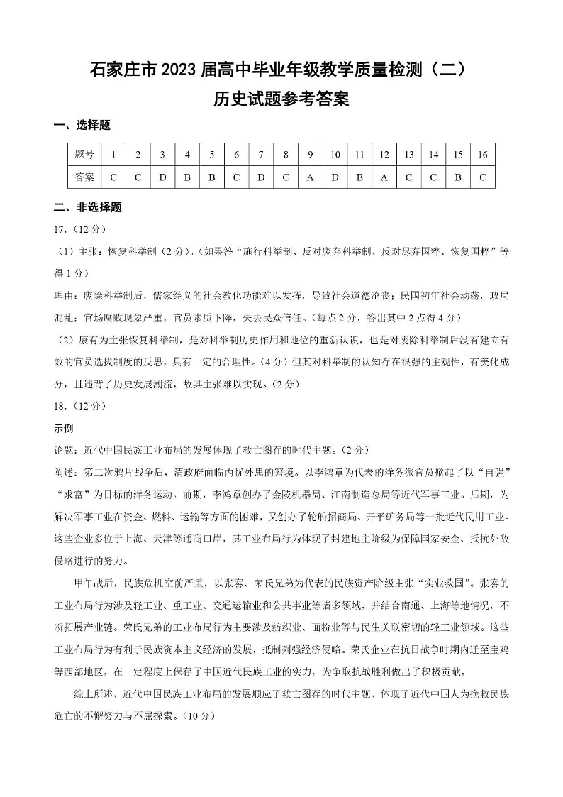 高三历史答案--河北省石家庄市2023届高中毕业年级教学质量检测(二)(石家庄二模)