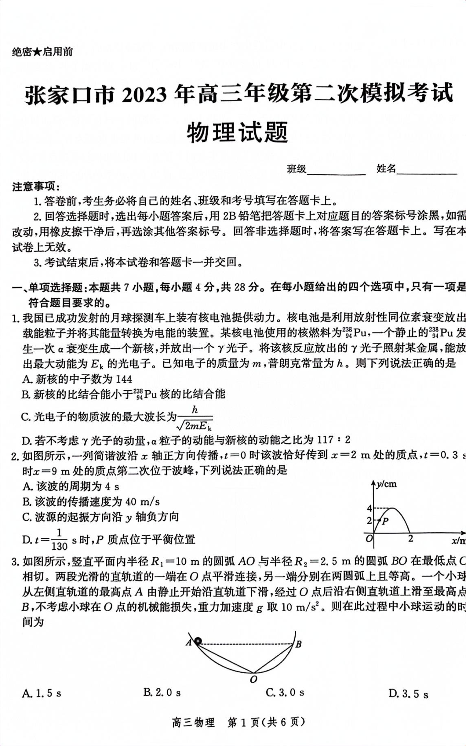 高三物理--河北省张家口市2023届高三二模