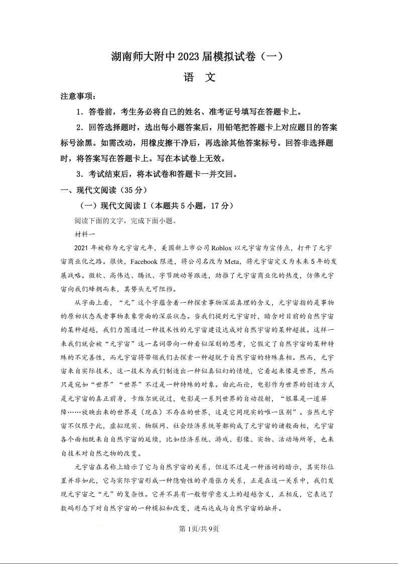 高三语文(原卷版)--湖南省长沙市湖南师范大学附属中学2023届高三下学期模拟检测(一)