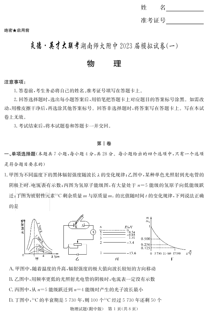 高三物理--湖南省长沙市湖南师范大学附属中学2023届高三下学期模拟检测(一)