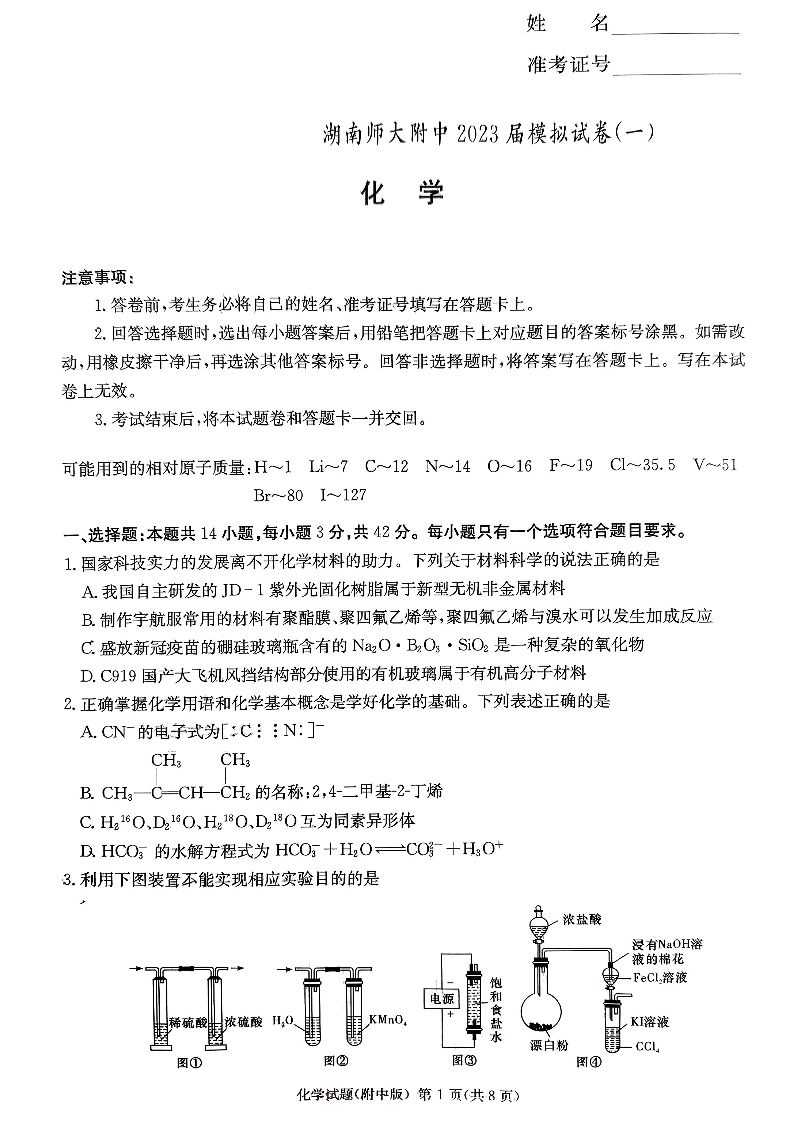 高三化学--湖南省长沙市湖南师范大学附属中学2023届高三下学期模拟检测(一)