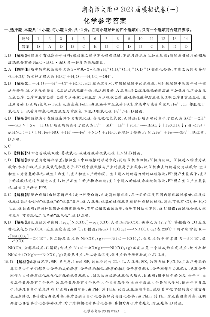 高三化学答案--湖南省长沙市湖南师范大学附属中学2023届高三下学期模拟检测(一)