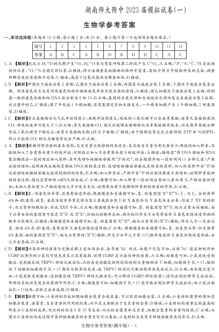 高三生物答案--湖南省长沙市湖南师范大学附属中学2023届高三下学期模拟检测(一)