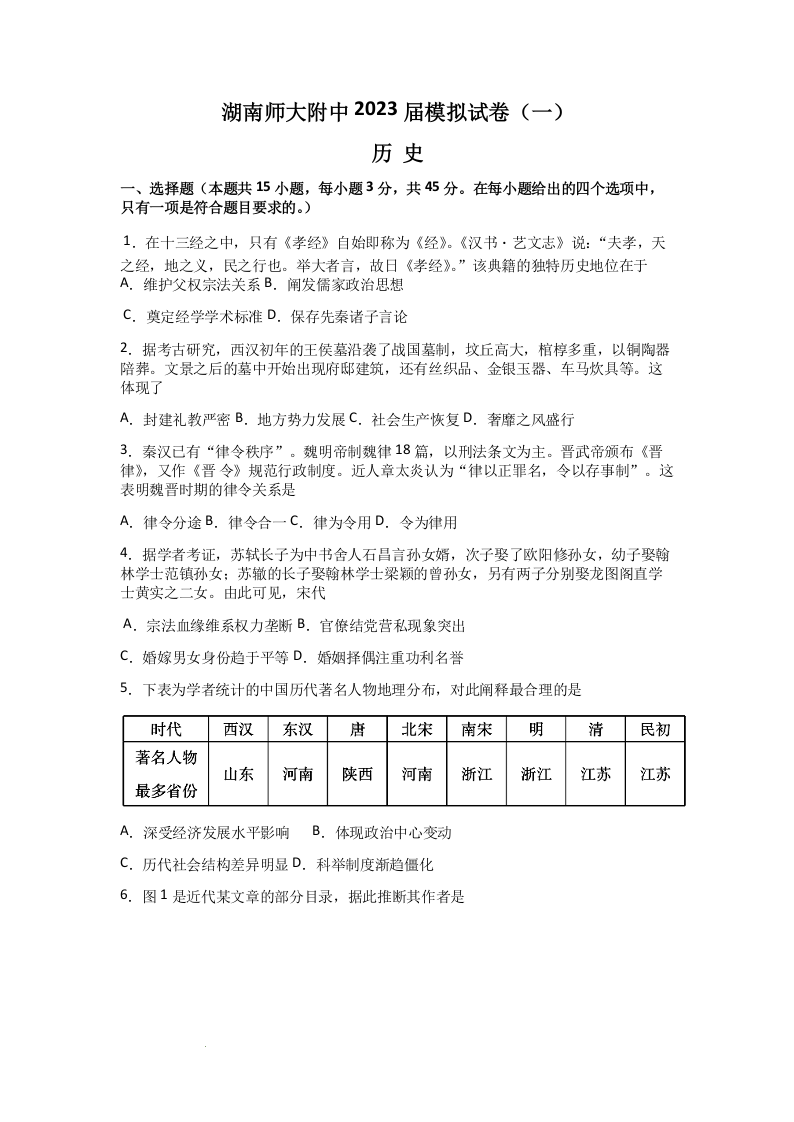 高三历史--湖南省长沙市湖南师范大学附属中学2023届高三下学期模拟检测(一)