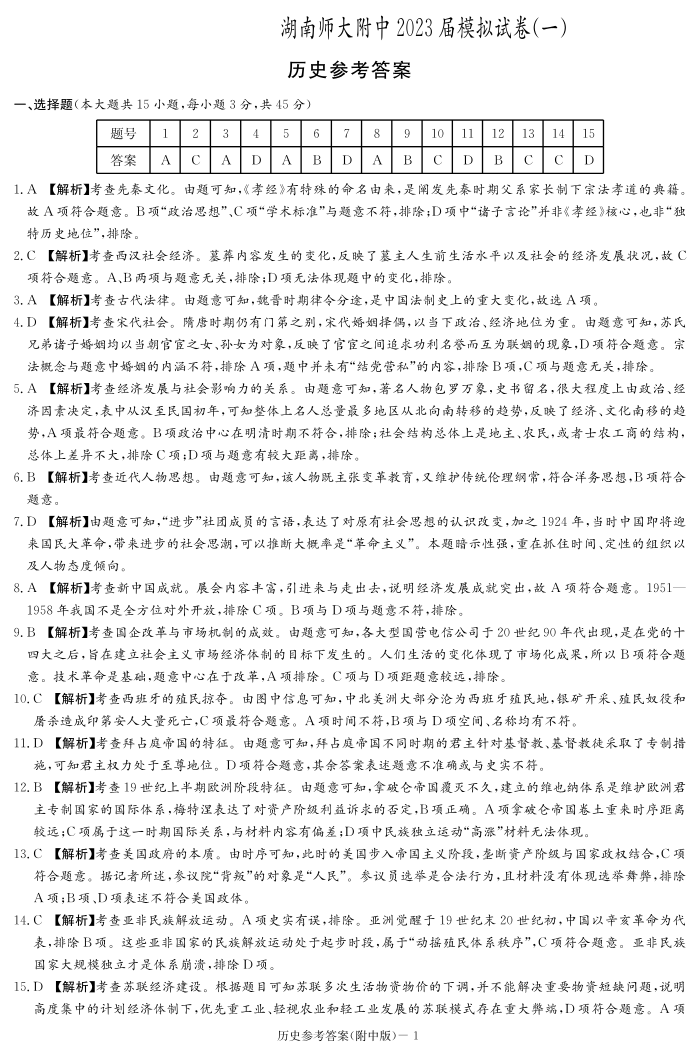 高三历史答案--湖南省长沙市湖南师范大学附属中学2023届高三下学期模拟检测(一)