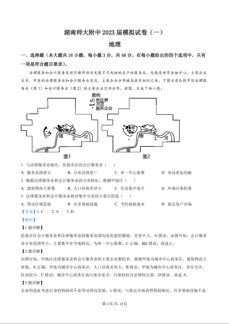 高三地理(解析版)--湖南省长沙市湖南师范大学附属中学2023届高三下学期模拟检测(一)
