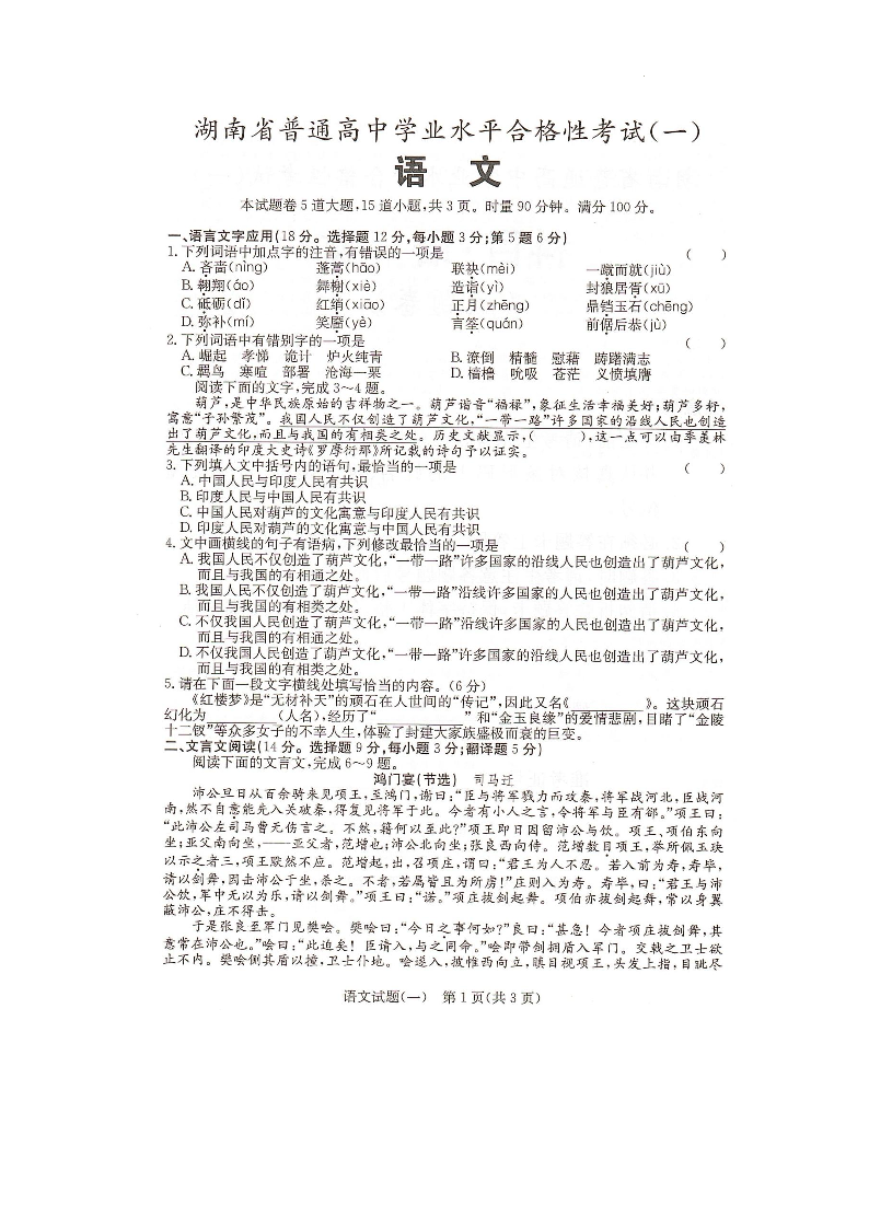 高三语文+答案--湖南省2023年普通高中学业水平合格性考试(一)