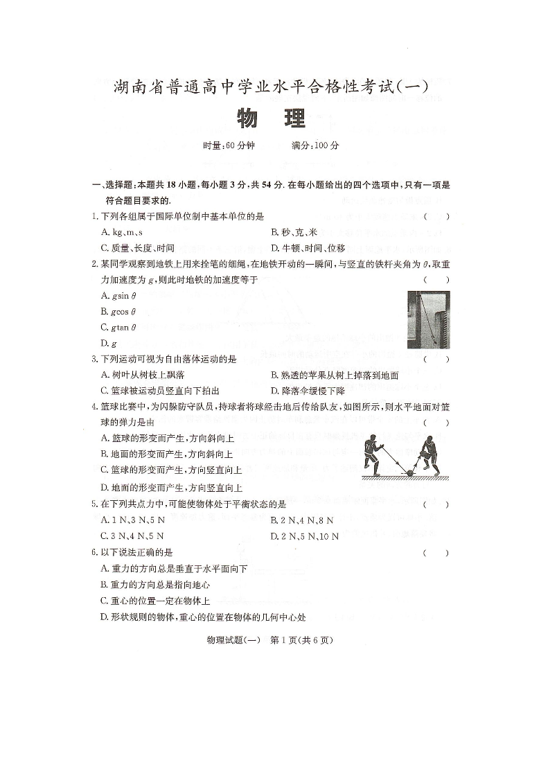 高三物理+答案--湖南省2023年普通高中学业水平合格性考试(一)