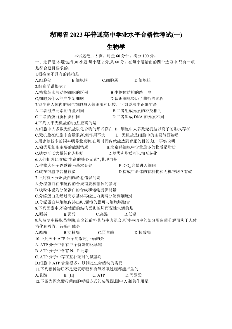 高三生物+答案--湖南省2023年普通高中学业水平合格性考试(一)