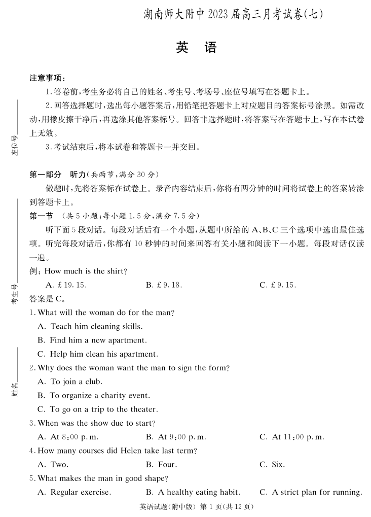 高三英语--湖南省师大附中炎德英才2023届高三月考(七)