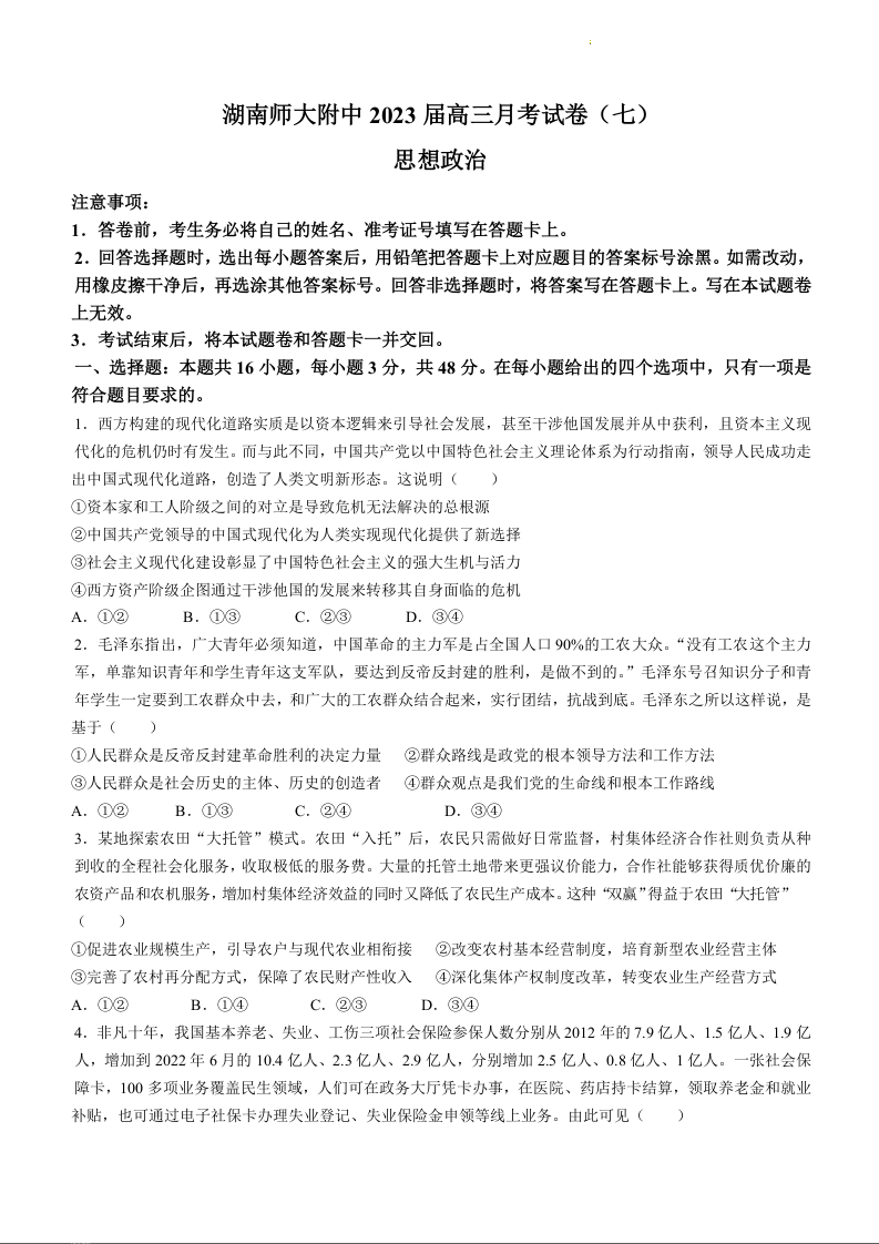 高三政治+答案--湖南省师大附中炎德英才2023届高三月考(七)