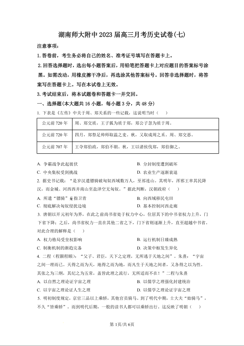 高三历史(原卷版)--湖南省师大附中炎德英才2023届高三月考(七)