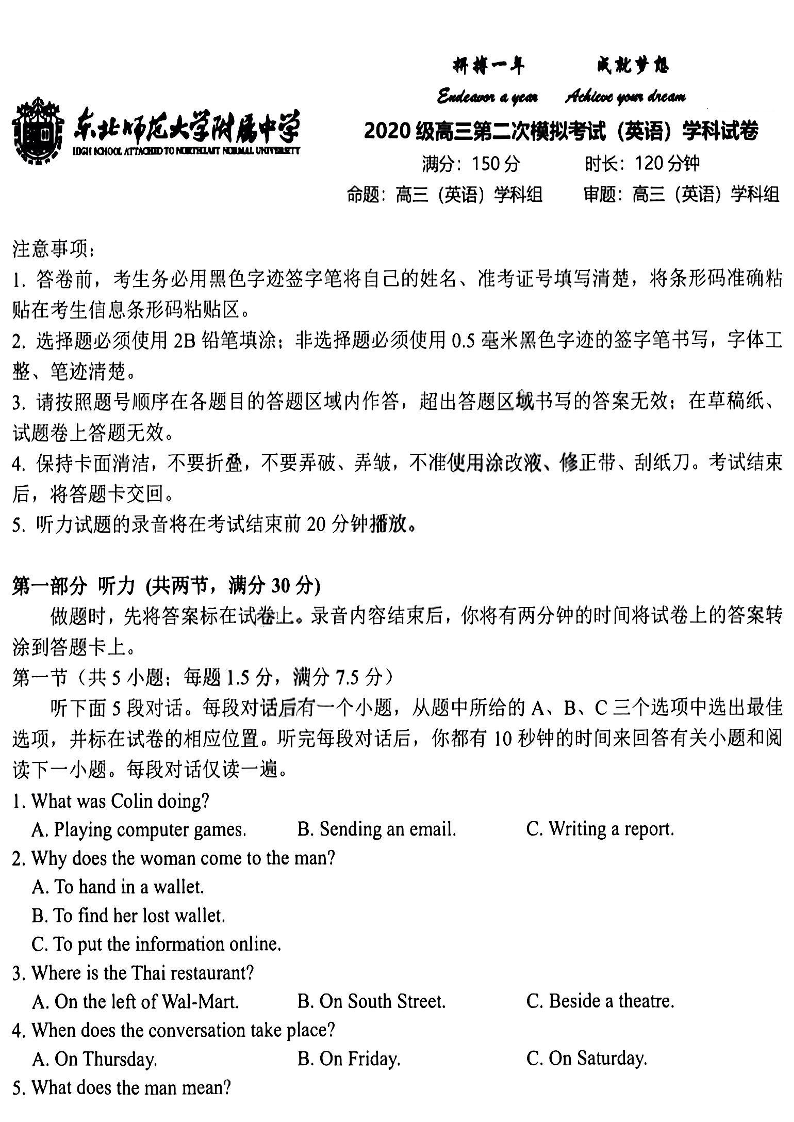 高三英语+答案--吉林省长春市东北师范大学附属中学2022-2023学年高三下学期第二次模拟考试