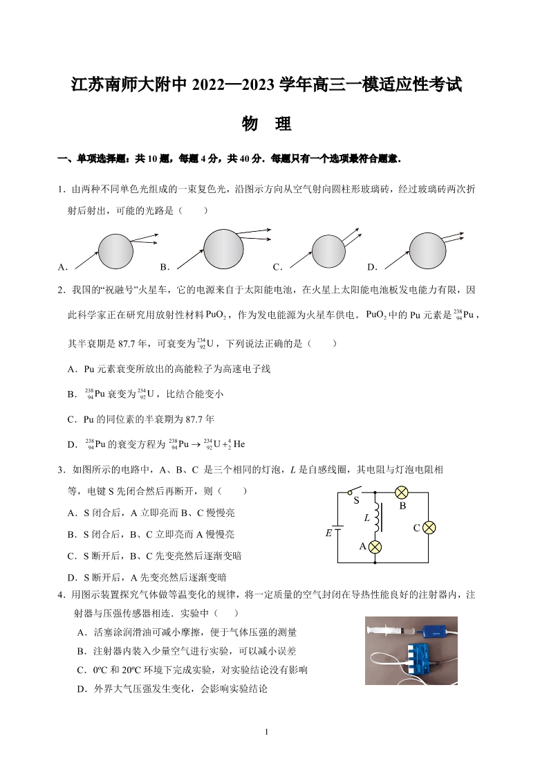 高三物理+答案--江苏省南京师范大学附属中学2023高三一模适应性考试