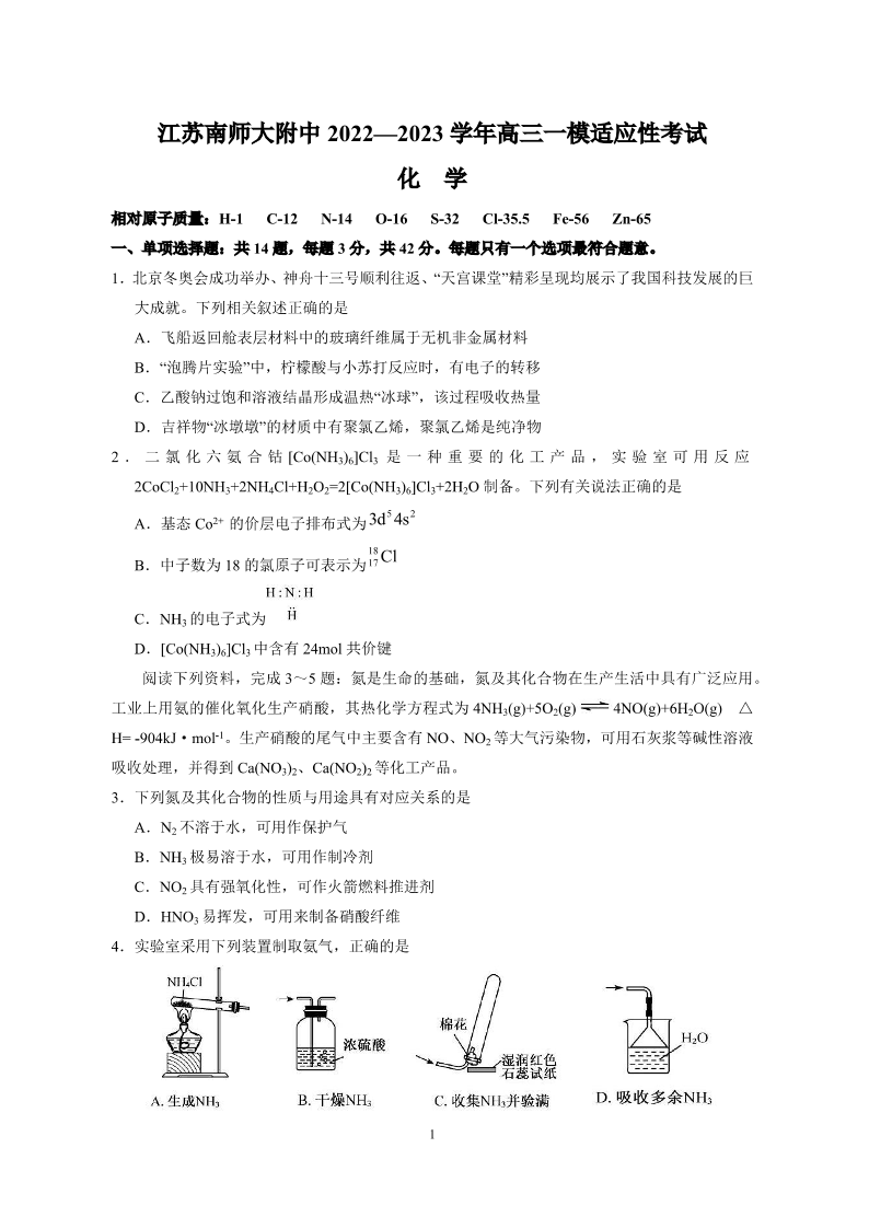 高三化学+答案--江苏省南京师范大学附属中学2023高三一模适应性考试
