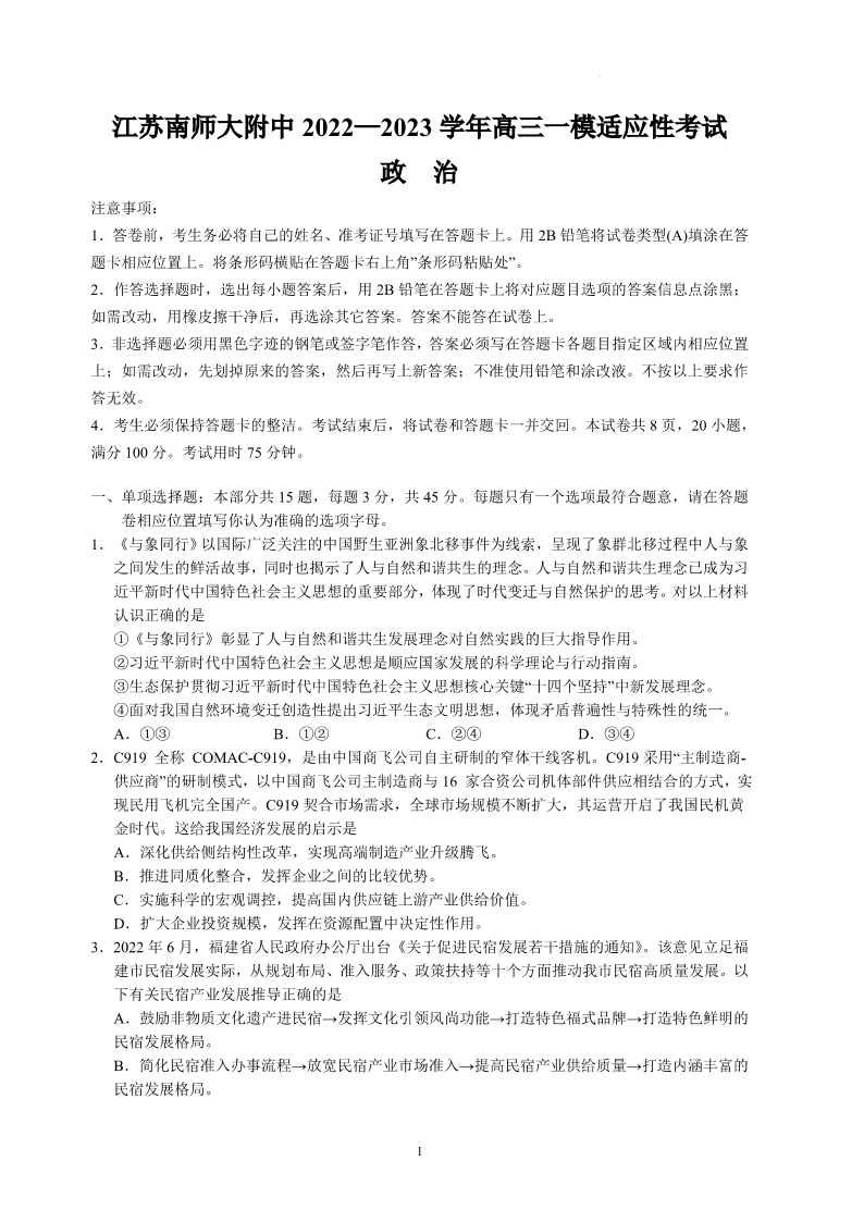 高三政治+答案--江苏省南京师范大学附属中学2023高三一模适应性考试