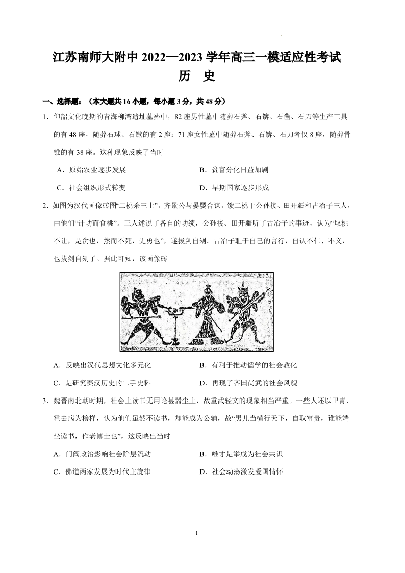 高三历史+答案--江苏省南京师范大学附属中学2023高三一模适应性考试
