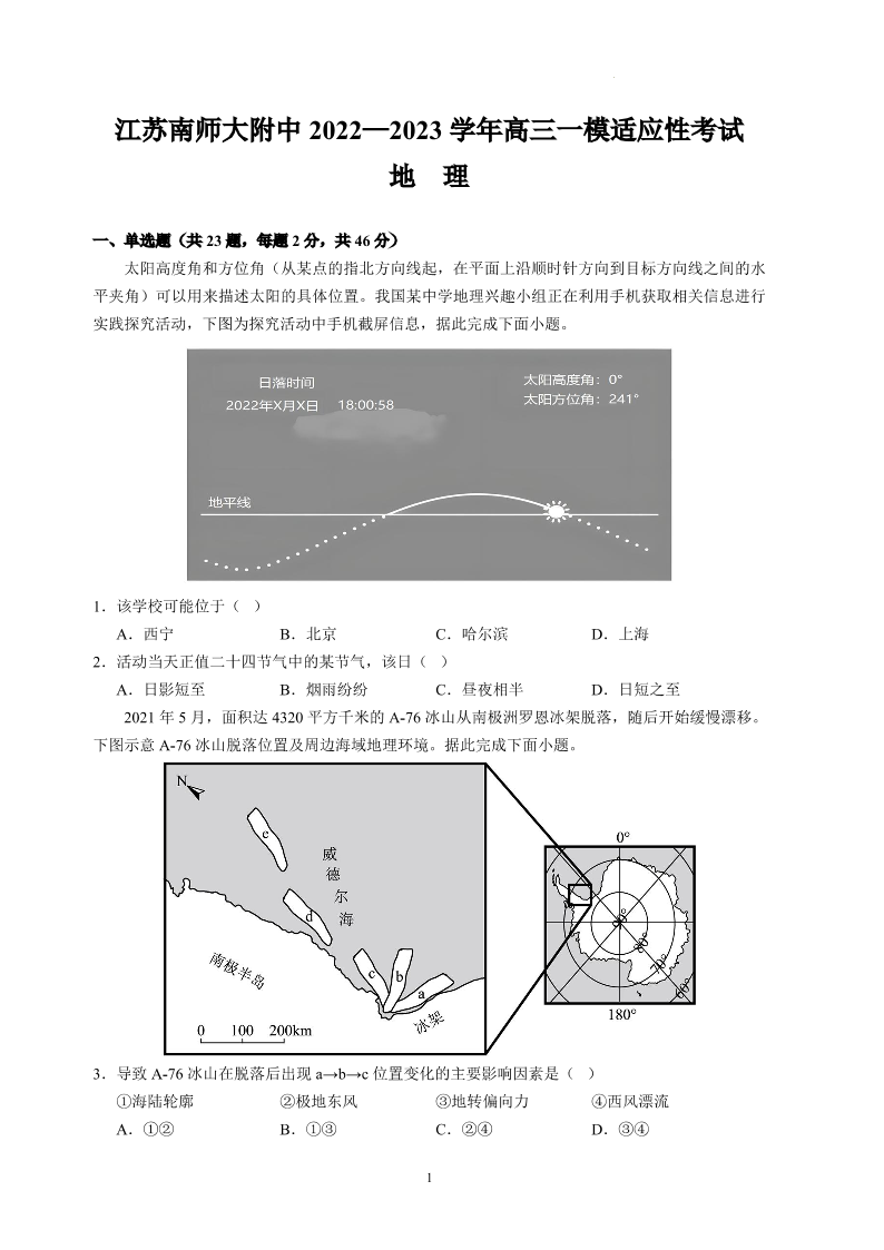 高三地理+答案--江苏省南京师范大学附属中学2023高三一模适应性考试